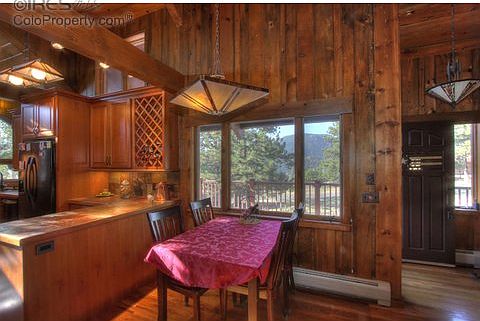 One of the best locations in Estes! Beautiful setting in the rocks and trees.Longs Peak View, totally remodeled home! Main Level living with vaulted wood beamed ceilings, all new gourmet kitchen, hard wood floors, & in-floor heat. Living room has massive moss rock fireplace. Master suite with private bath, walk in closet, private hot tub gazebo. Upper level with 2 large bedrooms, Jack-Jill bath, loft sitting area with coffee deck. Extra living spaces, spacious and fun! 2 car over sized garage.