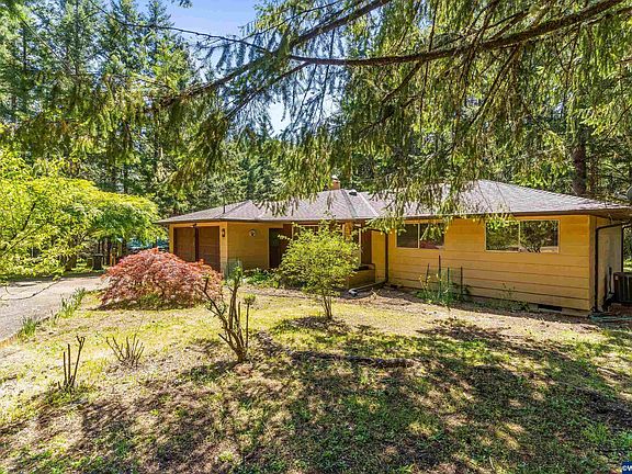 Serene, private setting for this 1 level, solid home. Situated on 1.77 acres. Kitchen with Madrone wood cabinets. Vinyl windows in most of home. Leaf filter gutter covers, 2021. Cozy family room with a wood stove. Large double garage with workbench, and pull down storage access. Covered deck overlooking the yard, with a fenced garden space, wood/garden shed.