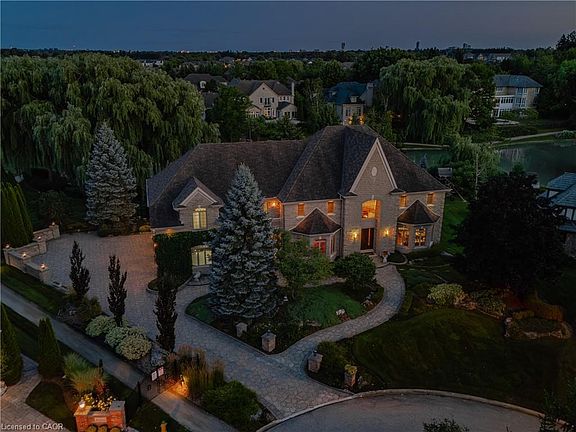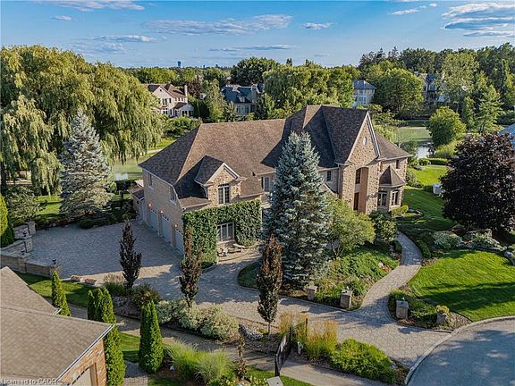 Exquisite Lakefront Estate in Prestigious River Oak Estates-Welcome to a rare & extraordinary opportunity-one of the only lakefront estates in the city, offering private access to Emerald Lake. Nestled on 0.53 AC of pristine waterfront, this custom-built legacy residence is a statement of timeless sophistication & luxury. Privately situated on a quiet court, this distinguished home offers 9,100+ SF of refined living w/ 5 beds, 6 baths, & resort-calibre amenities. Enter the grand foyer w/ soaring ceilings, sweeping staircase, & classic centre hall plan. The main lvl features a well-appointed formal living rm w/ gas fireplace, an exquisite dining rm,& a 2-storey great rm w/ gas fireplace & serene lake views, ideal for grand events/quiet moments. The chef’s kitchen incl. granite counters, centre island, walk-in pantry, & breakfast area w/ patio access, ensuring seamless indoor-outdoor living. A flexible den w/ built-in bar (future main-flr brdm potential) & two 2-pc baths complete this lvl. Freshly painted main lvl & upper hallway, updated light fixtures, new window coverings in living/dining rms. Dual staircases lead to an upper lvl catwalk overlooking the great rm, foyer & lake. The private primary wing features a luxe 5-pc ensuite, dual walk-in closets, dressing lounge w/ balcony, office/exercise area, & kitchenette/laundry rm. 3 add’l bedrms, each w/ access to a bathrm. Bonus upper loft w/ gas stove adds versatility. The lower lvl includes a renovated home theatre w/ motion-activated seating & a spacious rec rm. This lvl also offers in-law/nanny suite potential, w/ bedrm, bathrm, workshop/multi-purpose area (future kitchen), & walk-up access to the garage. Landscaped grounds evoke a resort retreat, featuring in-ground pool, expansive patios, & outdoor kitchen. A covered gazebo/lounge, framed by mature trees & lake views, offers the ultimate place to unwind. Steps from Kiwanis Park, trails, Grand River, shops, schools & HWYS-this is a once-in-a-lifetime opportunity