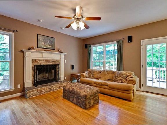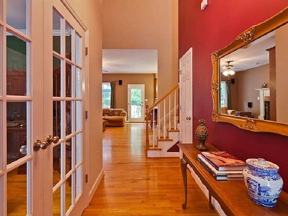 Custom home with all the features you could want on a 1.28 acre, very private wooded lot in walking/biking distance to library, post office, schools, and historic downtown Wake Forest. Small creek runs through back of lot. Huge fenced backyard (play fort/swings negotiable). Large deck recently refinished and a separate cement patio with gas tap for gas grill. Walk-in crawlspace with cement pad for lawn equipment/tractor. Finished garage with utility sink. Vaulted foyer. 9 ft ceilings downstairs. Hardwood floors. Lots of windows, all with great views. Dining room or formal living room (currently set up as office) has crown molding, wainscoting, and french doors. Family room has built-in cabinets with space for large flat screened TV and components. Family room is surround sound wired. Fireplace has stone hearth and surround and is wood-burning with gas starter. Large kitchen, all appliances convey. Built-in desk/hutch. Walk-in pantry. Two huge walk-in closets in master bedroom. Large master bath with dual sinks, separate garden tub and huge shower, linen closet, and toilet closet. Laundry is upstairs (washer/dryer negotiable). Large walk-in attic space and additional large floored attic space with pull down stairs. Dual heat/ac. Security system. Neighborhood Description We are a small group of homes located between Deacons Ridge and Cardinal Crest subdivisions. These are quiet neighborhoods in the heart of Wake Forest. Easy access to 98 bypass. No HOA dues.