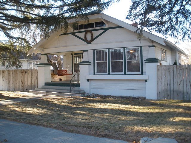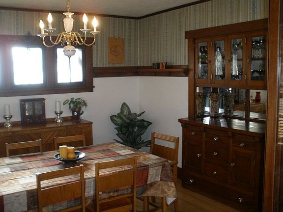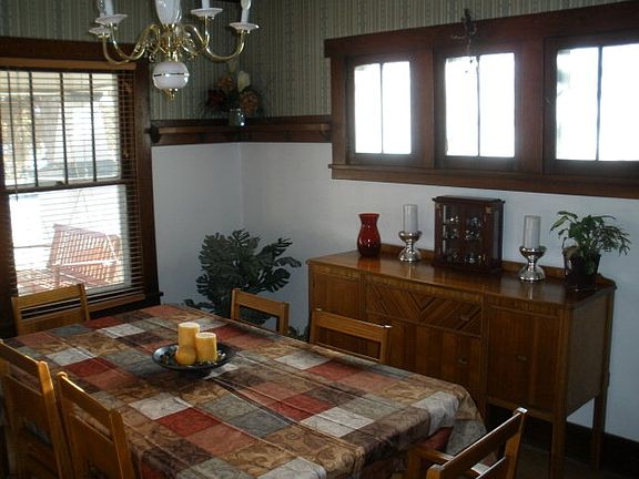 Classic home with many features. Start with the covered porch with swing. Well kept hardwood floors and custom wood work including vertical pine trim. Sparkling glass french doors dividing the welcoming living room and formal dining room with built-in hutch. There is newer paint and carpet throughout. Bright kitchen with built-in breakfast nook. Two bedrooms and bathroom on main floor. There is a big bedroom and additional bathroom with shower in basement. Second kitchen in basement. Basement also includes a cozy family room with gas fireplace. Gas forced air heat. Established yard with mature trees, firepit, detached garage all within a private wood fence. This well priced property is close to schools and ready for a new owner.