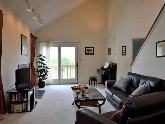 Spacious end unit townhouse in Deer run filled with natural light. This stylish home is in move in condition and offers a living room with cathedral ceilings and gas fireplace, main level master bedroom with bath, spacious kitchen with top of the line Bosch dishwasher and convection oven. Upstairs bedroom and full bath plus a lower level bedroom and family area. Enjoy your morning coffee on the deck with panoramic views and forever wild land. All the amenities with central air and attached garage. Minutes to Ithaca College, Cornell and Downtown.