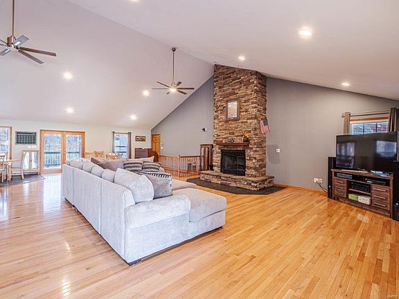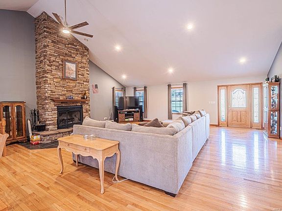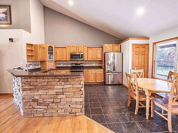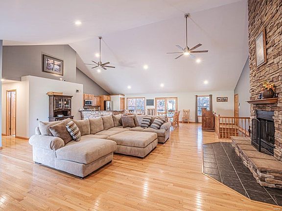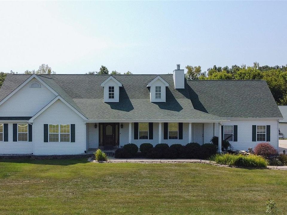 Back on mkt at no fault of seller. Beautiful 5 bed, 3 bath ranch home w/5 car garage! Wide open floor plan that allows you to entertain in the vaulted Great Room w/ a full stone fireplace. Wood flooring throughout this home. Kitchen has custom cabinets, double oven, farm kitchen sink, & pantry. Master suite features french doors that walk out to the covered deck! Great place to enjoy the outdoors! Master bath has jetted tub, separate shower, & double sinks. Other bedrooms are large & have plenty of closet space. Main floor laundry area. Plenty of room for a formal dining area or spread out the great room! Doors lead off to the covered balcony to enjoy the outdoors. Wide, solid oak stairs lead to the LL. You will find a family room, 2 bedrooms, full bathroom, & full kitchen! Double doors lead out to the patio & above ground pool! Insulated 50x60 outbuilding w/3 stalls, wash area, & tack room. Pasture area could be fenced, round pen, all ready for that small horse family!