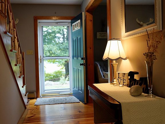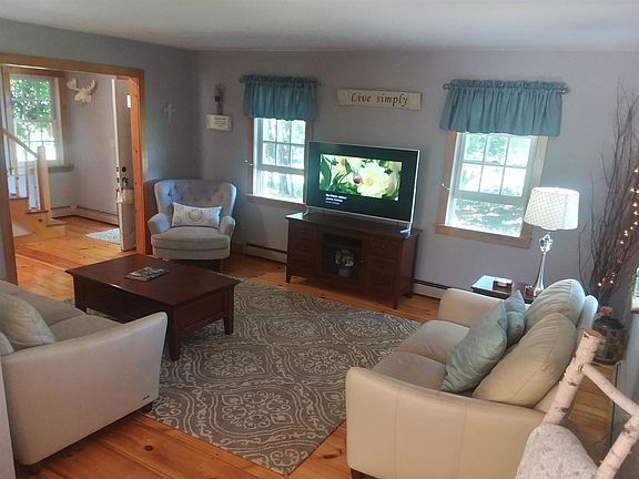 This picturesque Cape home located on 9.3 acres offers a meandering driveway meeting a small orchard with cherry, apple, pear and peach trees. A granite walkway to the foyer with wide plank pine floors harvested from the property gives a warm Vermont welcome. Notice a beautiful kiln dried birch spindle staircase (2019) and a light filled living room equipped with propane gas connection for a fireplace. A transom window over the kitchen sink highlights the Kraftmaid cabinetry, Corian counters and oversized pantry. A hall from the dining area leads to the master offering French doors, a walk-in closet, en suite bath with radiant heat, double sinks, separate commode and steam shower. A remodeled rear entry, with a tile floor and ship lap walls, offers space to shake off coats and shoes. You'll appreciate the 3/4 bath with Samsung Smart wash/dryer (12/2019) and large den/office/4th bedroom. On the second floor to the right is a large attic space with access to the attached two car garage loft. It offers a large full bath, a storage room that could be opened to the foyer below, and bedroom 2 and 3. Bedroom 3 includes a partially finished bonus room and closet. Updates include: new interior and exterior lighting, epoxy floor and painted walls in basement, all fresh and neutral interior paint, Jacuzzi off the back deck, exterior siding, deck power washed, updated landscaping with perennials. Fiber optic internet helps make this property a perfect, peaceful retreat to call home.