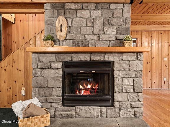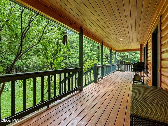 Peace&tranquility abound at this cozy log home on 14acres. Main level offers comfortable LR feat cultured stone fireplace; open to the country kitchen and dining area w/ a breakfast bar in between. Enjoy private backyard views at the bay window! First floor den/bedroom tucked away w/ full bath; laundry in mud room. Woodstove in the basement for supplemental heat in home & downstairs rec area/workshop (bilco doors to exterior) All 3 bedrooms on second level are spacious with plenty of storage (primary WIC&dormer access) Barn-style garage (5 spaces) & full size workshop upstairs & 2 rock climbing walls for fun! Spend hours walking the groomed .4mi loop out back w/ a natural spring&creek! Two water features&stone patios to entertain! 21mi to Albany/27mi to Ski Wyndham, endless possibilities