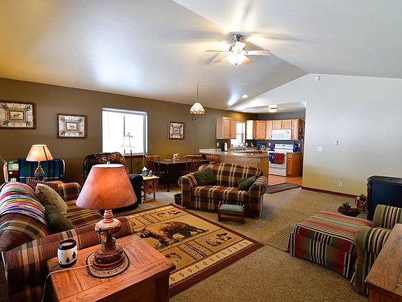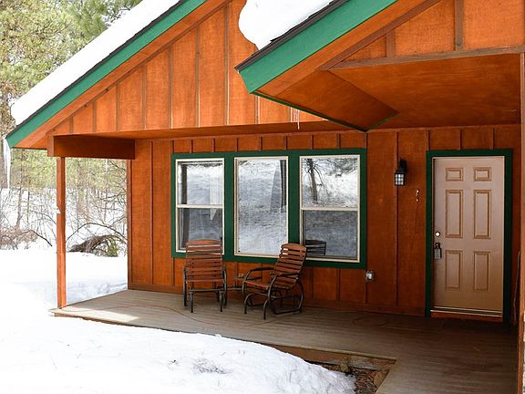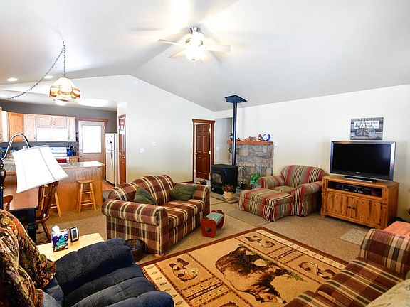 Nifty and tidy single level cabin nestled in mature Ponderosas with a seasonal creek winding thru the property. Filtered peaks of mountains to the east from this rolling .34 acre homesite. A generous and open kitchen/living/dining area plus 3 bedroom, 2 bath, a large laundry room and attached 400 sf garage. Granite tiled kitchen countertops with laminate wood kitchen floor. Pellet stove and baseboard heating. Covered entry and porch. Private and covered rear deck. Composite roof, paved driveway. Easy walking proximity to the Clubhouse, golf, tennis and pool of MeadowCreek Golf Resort. Seller is leaving some furniture and the washer, dryer and refrigerator are included!