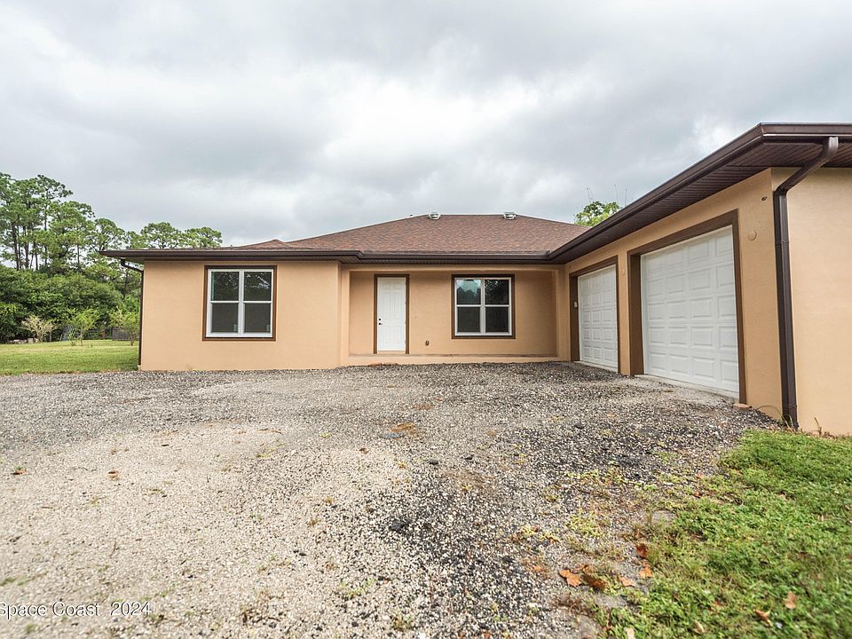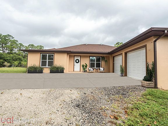 Welcome to your dream home! This stunning custom-built residence, completed in 2017, offers an unparalleled blend of luxury, comfort, and modern conveniences. Nestled on nearly 3 fenced acres in the picturesque area of West Melbourne, this property is a rare find, boasting agricultural zoning and over 3,000 square feet of living space. The home features an open island kitchen with 42-inch cabinets, a walk-in pantry, and granite countertops. The luxurious master suite includes a tray ceiling, double walk-in closets, and a spa-like bathroom with dual granite vanities, a freestanding clawfoot tub, and a beautifully tiled shower. Additional versatile spaces include a bonus room off the kitchen and another room with a private entrance, perfect for an office or gym. The expansive 750 sq ft garage with 8-foot overhead doors, fresh exterior paint (2024), hurricane shutters, and a whole house central vacuum system with "hide a hose" add to the home's appeal. Soaring ceilings trayed up to 11 feet, a 250-gallon propane tank (leased), and a stem wall foundation for soil displacement resistance are just a few of the thoughtful details. The property also includes a spacious laundry room, ample storage closets, a whole house water softener, and two wells (shallow for drinking water and deep artesian for irrigation). Home A/C and garage doors are app-controlled for added convenience.