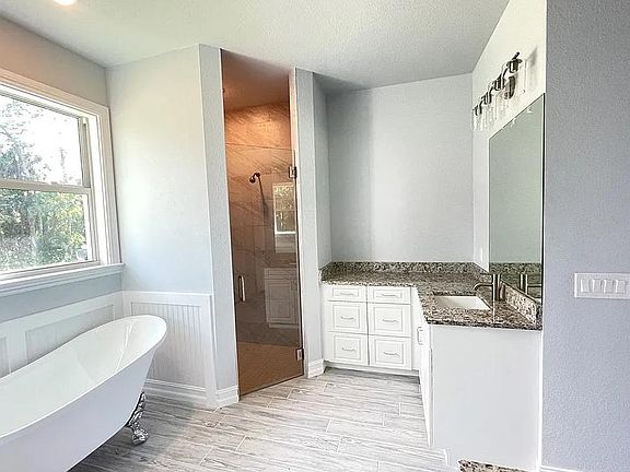 This is a 3 bedroom, two bath, two car garage home that boasts a metal roof, Hurricane Impact windows and doors, 9'4" flat ceilings with crowned trays in master and living room, whole house r/o system, wood cased windows, and plank tile throughout. The great room design has ample cabinetry with granite counter tops throughout and an Island kitchen that opens to the dining and living areas of the home. Owners suite has split sinks with clawfoot soaking tub and separate all tile shower with dual showerheads, also features separate walk-in closets and a large bedroom. lanai opens to a large back yard with a freshwater canal and can be fenced and still provide plenty of room for a pool.