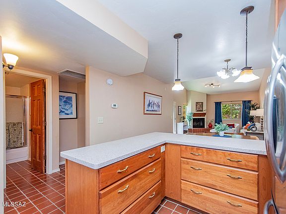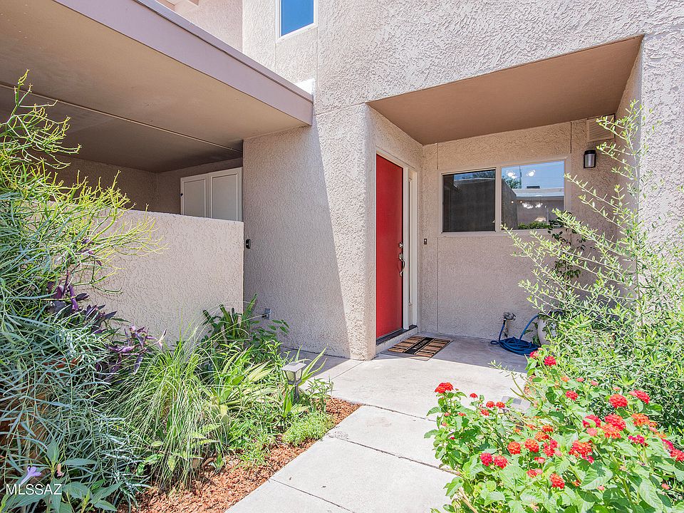 Beautiful option for first time home buyers, U of A students, young professionals, and folks who love the Tucson Racquet Club and loop bike bath. Upgraded and updated kitchen, new cabinets, appliances, counter tops and lighting. Walls removed to make the open floorplan most folks want. Charming living room fireplace for cozy winter nights. One bedroom/bath downstairs and upstairs master has super loft area visible from living room. Washer / dryer added under staircase and they stay. Downstairs is all tile floors, carpet upstairs only. One car garage with new opener, extra storage cabinets, lovely outside patio opens to huge courtyard with pool area. HOA covers water,garbage, roofs,exteriors, outer insurance, pool, grounds,termites. maintenance. HOA covers, water, roofs, pool, front landscaping, building exterior, termites, building insurance etc.