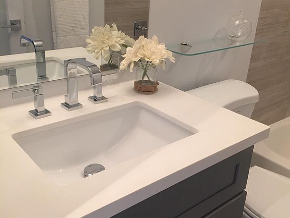 Private balconyBreakfast barModern pendant lightsModern gray hardwood flooringStainless steel sinkCustom built-in california closetGranite countertops