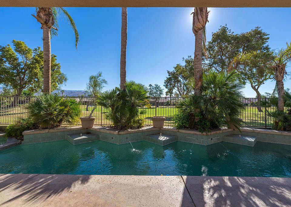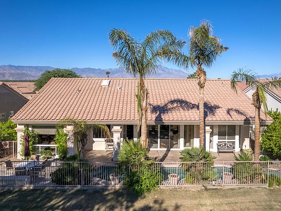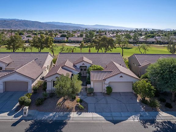 Sun City Palm Desert - Monaco. Sitting elevated over the 13th fairway, this estate model home has an east facing rear yard with panoramic golf course & mountain views, and features a beautiful pool and spas surrounded by a spacious salt-finished patio & lush landscaping. A gated front courtyard and double door entry provides curb appeal. Inside, tile flooring is used extensively. The great room has a 12ft ceiling, double slider to the rear yard and built-in media center with shelving. 10ft ceilings are elsewhere. The family room has a custom built in media center that accommodates a large tv. The kitchen has a large island with breakfast bar, corian counters, double wall ovens, a skylight and large pantry. An ample sized office has a custom built-in desk and shelving. The primary suite has a bay window and a large walk-in closet with built-in storage. The primary suite bathroom has dual sinks, oversized tub and stall shower; surfaces are cultured marble. The extended guest suite has a closet with custom built-in storage. A shower/tub is in its bathroom. The powder room has a pedestal sink. The 2+ golf cart garage has an epoxy floor, utility sink and built-in storage. Dual AC with electronic air filtration new in 2005.