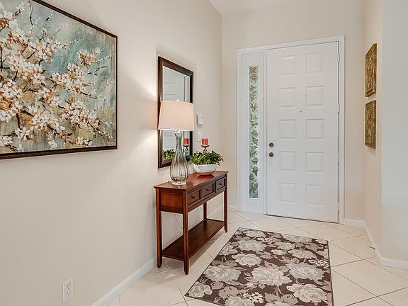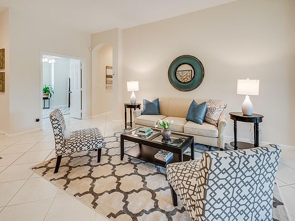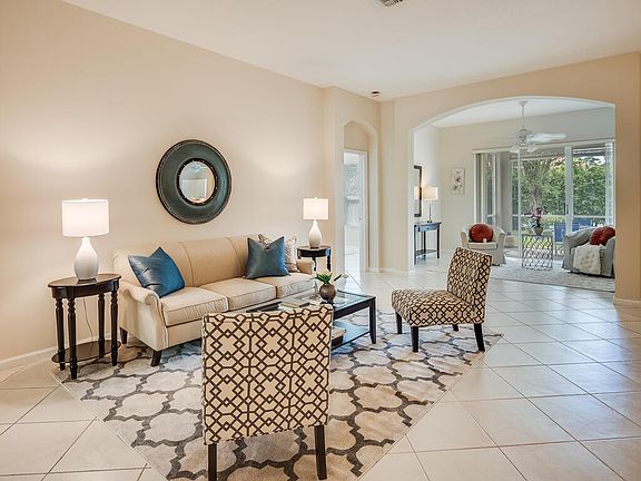 Charming, well-maintained, elegant home in sought-after 55+ gated community. Volume ceiling w/dramatic arch passageways. Upgraded tile flrs (laid on the diagonal) throughout. Interior freshly painted in neutral tone. Spacious, open floorplan w/split bedroom layout. Large Owner's suite boasts 2 closets (1 Walk-In), dual sink vanity, soaking tub & sep shower. Light & bright Kit w/eat-in breakfast area. Sep Laundry Rm. Screened, covered patio overlooks nicely landscaped backyard. 2 car garage. Professionally staged. Outstanding community amenities incl Clubhouse w/organized social events, pool, jacuzzi, tennis/pickleball, billiards, exercise facility, shuffleboard & bocce. Excellent location Turnpike & Wellington amenities (mall, restaurants, grocery & shopping). Approx 8 miles to LW Beach