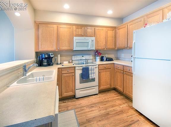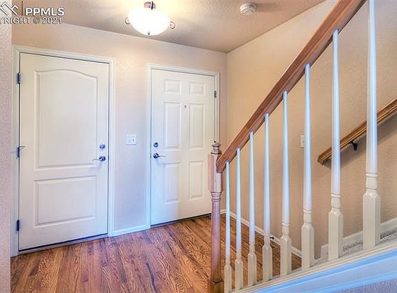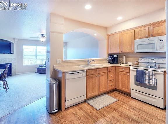 LIKE NEW TOWNHOME WITH NEW CARPET AND PAINT. NEW KITCHEN SINK AND NEW DISHWASHER. VERY WELL CARED FOR AND UPGRADED BY OWNER. BEAUTIFUL HARDWOOD FLOORS IN ENTRY AND KITCHEN. 1/2 BATH WITH TILE FLOORS CONVENIENTLY LOCATED OFF OF ENTRYWAY. SEE THROUGH KITCHEN INTO LIVING ROOM WITH GAS FIREPLACE AND WALK OUT TO 7X13 DECK, NICE VIEWS OF LIGHTS AT NIGHT. UPSTAIRS INCLUDES TWO SPACIOUS BEDROOMS WITH TWO FULL BATHS WITH TILE FLOORS AND TILE ENCLOSURES. MBR HAS MOUNTAIN VIEWS WITH OPEN SPEACE. UNFINISHED BASEMENT PROVIDES OPPORTUNITY FOR INCREASED EQUITY. NINE FOOT CEILINGS, WALK OUT AND ROUGH IN FOR BATH ADDS TO THIS OPPORTUNITY. LOCATION IS IDEAL AS IT IS IN THE LAST BUILDING TO THE WEST WITH ADJACENT OPEN SPEACE AND EASY ACCESS TO POWERS BLVD, THE MAIN NORTH/SOUTH CORRIDOR TO I-25.