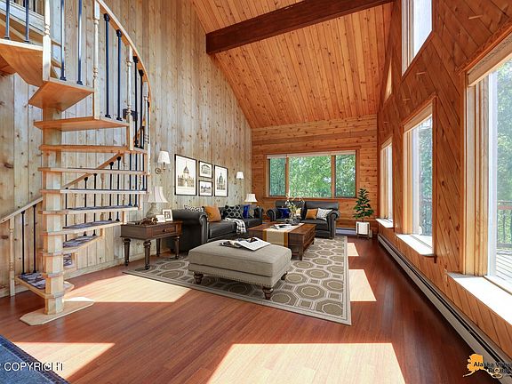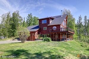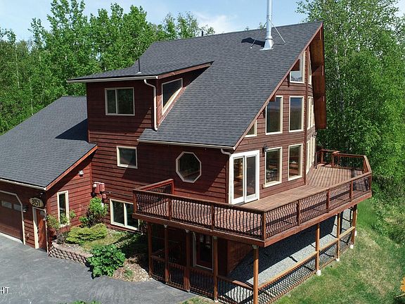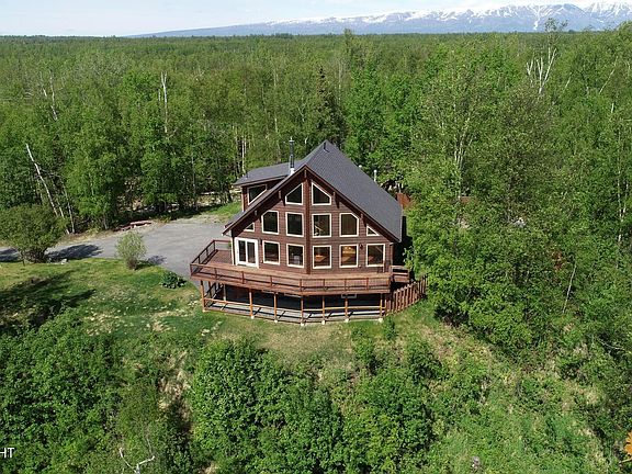 Alaska living at its finest! Bright sweeping stadium mountain views with a wrap-around deck, plumbing set for a spa on the deck! This home features lush floor-to-ceiling window walls, vaulted ceilings, a loft, two kitchens, barn doors, a paved driveway, set up for a generator, and wood finishes throughout. It is also zoned for chickens! 1 full bath, 2 3/4 ''shower no tub''