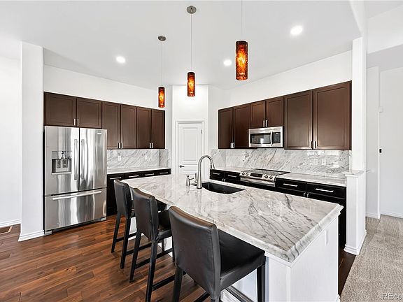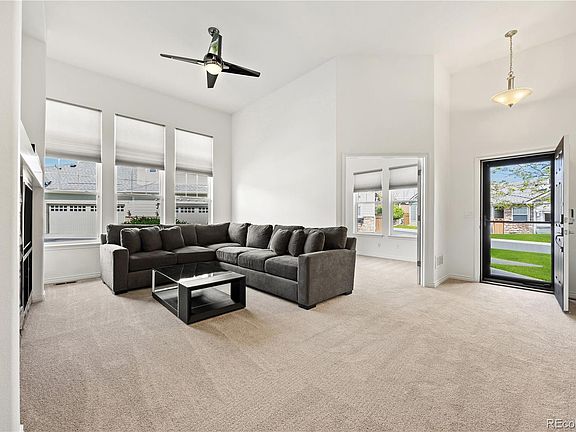Welcome to maintenance-free living! Lakefront at Broadlands is a meticulously cared-for community with brand-new roofs, fresh exterior paint, and strong HOA reserves that keep everything pristine without you lifting a finger. This spotless single-story end-unit greets you with vaulted ceilings, main-level hardwoods, and freshly painted walls softened by plush new carpet—no detail overlooked in this stylish, move-in-ready home! Serve crowd-pleasers from the marble kitchen island, then drift downstairs to a finished basement built for fun: a full wet bar, game room, comfy media lounge, and wiring for lighting, projectors, TVs, and more. Whether it's poker night, Sunday football, or a milestone party, the space adapts to the occasion. Enjoy a large primary bedroom with a five-piece bath and huge walk-in closet, a bright front office that simplifies daily routines, and a secondary main-floor bedroom perfect for overnight guests. Twin patios invite grilling or sun-soaked fresh air. Comfort continues with central air, extra storage space, and an oversized two-car garage. HOA dues cover exterior care, snow removal, landscaping, water, trash, and neighborhood pool with clubhouse access. Golfers are steps from Broadlands golf course and minutes from Eagle Trace, Legacy Ridge, Colorado National, and Thorncreek. Year-round recreation flourishes at Paul Derda Rec Center and McKay Lake Park, offering miles of paved and natural trails around tranquil ponds. Broadlands Marketplace and Orchard Town Center deliver groceries, coffee, dining, and entertainment. Nearby leash-free areas and open space make daily strolls a delight. With every exterior detail handled by a proactive HOA, your only task is to enjoy the carefree Colorado lifestyle. Minutes to I-25 and Hwy 36. Short drive to Interlocken and St. Anthony North. Discover why Lakefront at Broadlands is the perfect low-maintenance home for you. Contact the listing agent to schedule a private tour today!