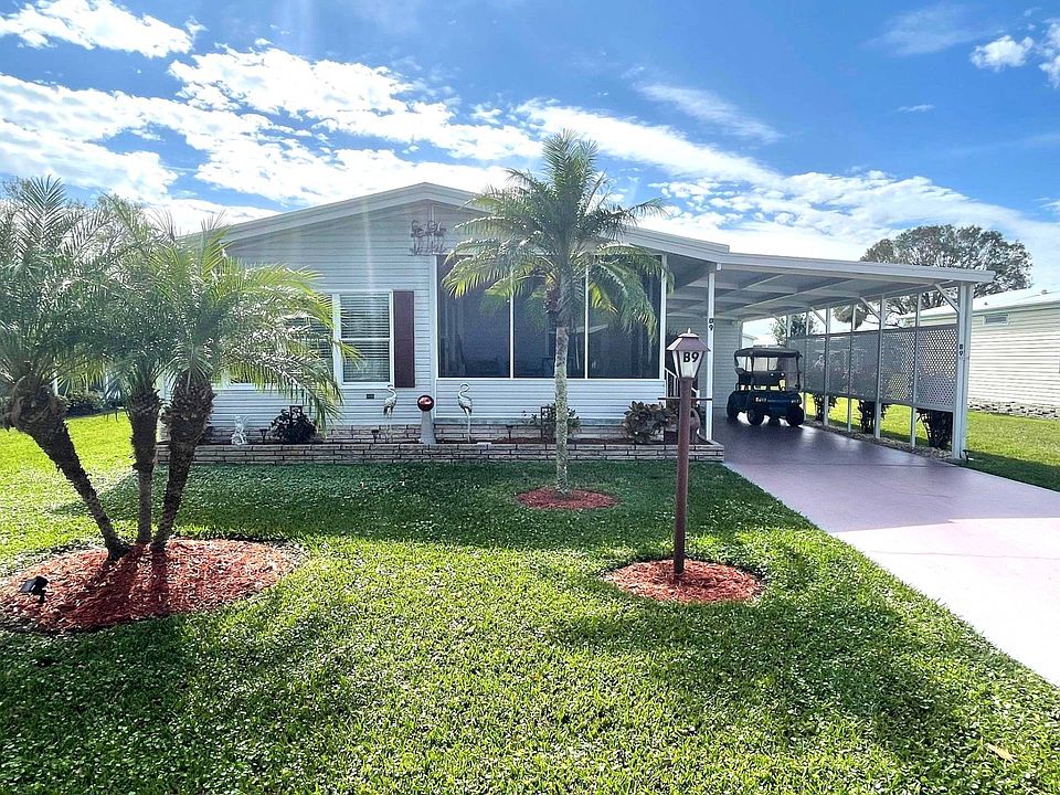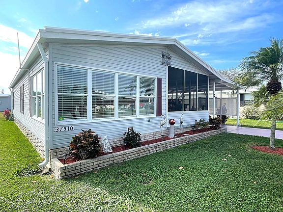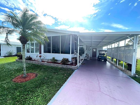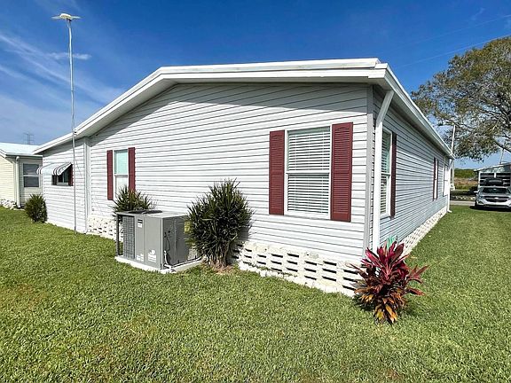 This is a two bedroom, two bath furnished double wide with tons of updates. Inside there is newer tile flooring throughout with new carpet in the bedrooms. There is also new appliances in the kitchen still under warranty. The kitchen has plenty storage in nice cabinets and new backsplash. The dining room has a glass table with cover. There are plantation blinds in all windows. The master bedroom is large with a king bed, walk in closet, and an ensuite bathroom with a step in shower. Both bathrooms have nice skylights in each. There is an attached Florida room with sleeper sofa. The whole home including the Florida room is cooled and heated with a new 3 ton A/C. Outside you will find great curb appeal with brick skirting. There is a large carport with extra support beams to keep it strong. At the back of the carport is a large storage/laundry room with washer/dryer and large hot water heater. The home also has an AMS roof. This home is completely outfitted with everything you might need, including the golf cart. you just need to bring your clothes. Call today!