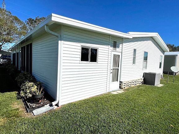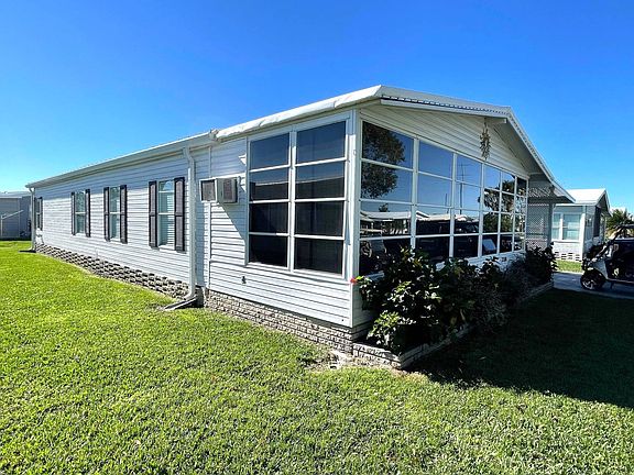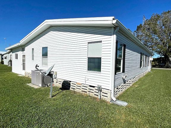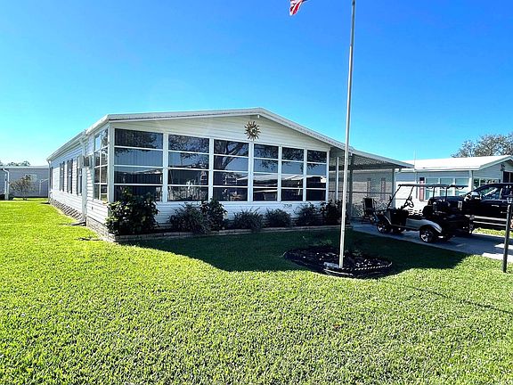 This is a beautiful 2 bedroom 2 bath fully furnished double wide with tons of extras. This home has newer flooring, paint, window treatments, and central A/C throughout. The living area has all new furniture and decorations including a new 75" TV on the wall. The kitchen is huge with newer appliances and a center island. There is a brand new dining set in the dining room. The oversized master bedroom has all new furniture including a 55" tv on the wall, as well as, a walk-in closet and an ensuite bathroom with new tile flooring and a walk in shower. The second bedroom also has new furniture and a walk-in closet. This home also has an attached Florida room with tile floors and tons of windows. It also has an in home laundry room with brand new washer and dryer. Outside is a new carport, new metal roof, a screened in patio and a large storage room with an extra refrigerator. There is also a well supplies multi zone sprinkler system to keep the lawn looking great. The extra large painted driveway leaves plenty of parking. Just bring your clothes. Move in ready.