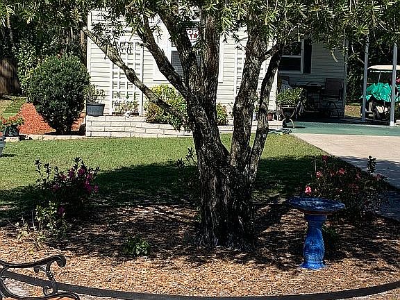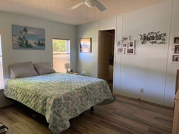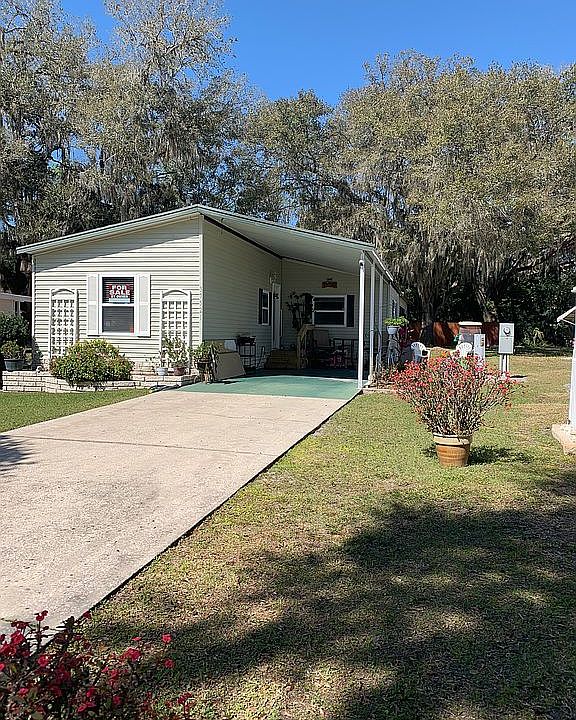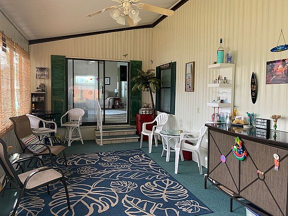 Barr mobile home located in cul-de-sac on perimeter property with stained privacy fence along back line. Property boasts a long driveway with 12’x24’ carport, new landscaping and a 12’x25’ Florida room with private entrance (new exterior door June 2024) and attached 8’x13’ utility/storage room. Updates include new single run flooring, interior paint, newly painted kitchen cabinets (soft close drawers), lighted ceiling fans, light fixtures, bathroom exhaust fans, exterior pressure treated entry stairs with platform, full glass entry door with built-in blinds, and new skirting. New 3 ton Rheem HVAC in 2021 with transferable maintenance package. The plumbing is CVPC, main house windows are double pane, the roof was pressure washed and recoated in May 2024. Whirlpool side-by-side refrigerator, GE electric stove and microwave hood along with dishwasher are included as well as new cellular top down/bottom up shades. Hall bathroom vanity replaced June 2024. Tropical Acre Estates is a 55+, leased land and pet friendly community. Current lot lease is $569/month which includes trash and yard waste pick-up, heated pool, hot tub, game room, shuffleboard and much more. HOA is currently $5/year and optional. Park rules, rent, and background checks must be handled through the Tropical Acre Estates office located on site. Showings are by appointment only. Motivated seller relocating. All reasonable offers will be considered. All measurements are approximate.