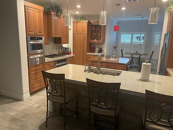 Extraordinary Home in Cottage Court with no HOA. Shows like a model home with numerous upgrades along with the most sought out RV garage. 2106 sqft., single story, 3 bedrooms 2 baths, located at the end of a cul-de-sac. Kitchen includes custom cabinets, Kitchen Aid stainless appliances, country sink, cambria stone countertops, warmer drawer, custom island with wine/drink refrigerator and a pot filler over built in stove. Master bedroom with retreat or office area with electric fireplace. Master bathroom has oversized shower, double sinks and customized walk-in closet. Shutters and ceiling fans throughout, electric fireplace in living area and wired for alarm system. 40ft RV garage with loft for storage, 50 amp outlet and 2 dump stations. Easy care desert landscaping, fenced back with large patio area. Furniture Included.