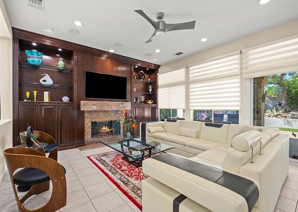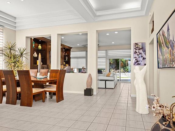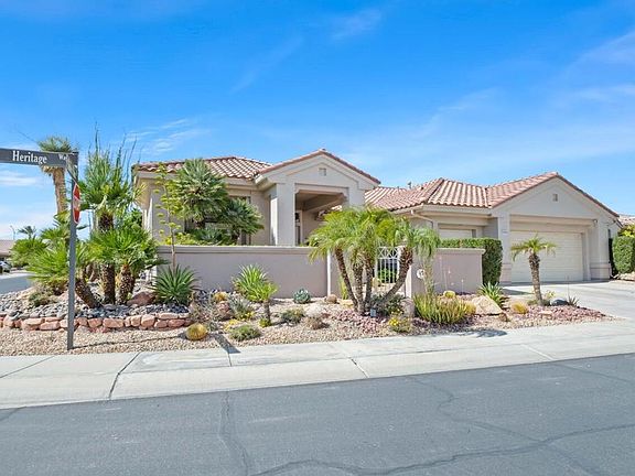 Elevate Your Living Experience in this Designer's Dream Home. Welcome to a luxurious Entertainer's Home. This Remodeled Estate Series Marquis plan in 2,415 Square feet 2BD/2.5 BA + Den / 3rd sleeping area has undergone a comprehensive transformation. Lightly used seasonal residence. Revel in detailed coffered 10 & 12ft ceilings, accented by modern fans & lighting. A contemporary, light & bright color palette elevates the home's aesthetic. The kitchen is a culinary haven: custom finished maple cabinets in a rich color contrasted by light quartz countertops, stainless appliances including double oven is a chef's dream! The great room features a living room area & Family room with extensive custom cabinetry on the entertainment wall. Enjoy the outdoors with West facing artfully designed landscaping w/ EZ-care maintenance extended patio, accessible from the primary bedroom & the living areas. Primary bedroom features a dream custom fitted closet. Upgraded baths feature updated finishes. Attached 2-car + Golf Cart garage. Washer & dryer incl. Furnishings & electronics available outside escrow per inventory list. Sun City Palm Desert offers 2 championship golf courses, 3 clubhouses, well-equipped fitness centers, sporting options & much more. Homeowners enjoy two in-house restaurants & over 90 active clubs. Sports include 2 gyms, tennis, pickle ball, softball and walking/jogging paths. Culinary delights await at the community's two in-house restaurants, coffee shop