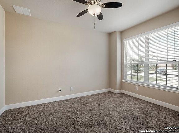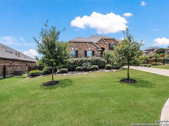 MOVE-IN READY home with open floor plan located in a cul-de-sac with one of the LARGEST LOTS in the Johnson Ranch subdivision. 3 CAR garage and LOTS of windows to view garden/mature fruit trees, covered patio and play set in back yard with green space. Kitchen with granite counter tops, built-in stainless steel appliances, and custom seating in breakfast area with separate dining room area located across from private study with french doors. Master bedroom with walk-in closet, garden tub, secondary bedroom and utility room downstairs. 3 bedrooms, additional living room and media room upstairs. Comal ISD.
