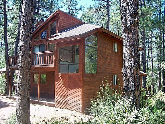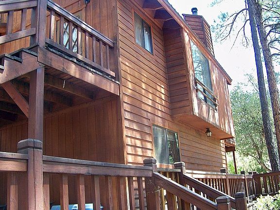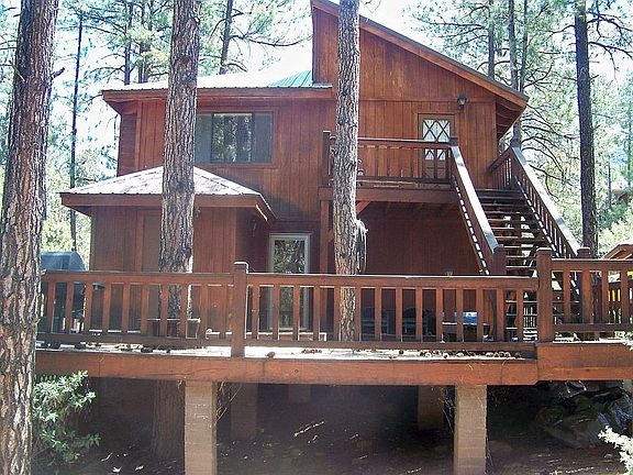 This beautiful home in the cool pines has so much to offer! Large, open spaces with vaulted ceilings and lots of windows make this a bright and cheery home! Cozy kitchen, wood burning stove, carpet and hardwood throughout. Decks all around and a gazebo type covered area perfect for relaxing and enjoying the awesome views! The property has been painted I do not have new pictures at this time.
