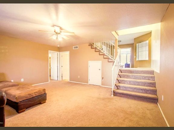 Exceptionally clean and move-in ready home in a great central Mesa location. Freshly painted exterior and new front yard landscaping which gives this large lot a crisp curb appeal. Ideal tri-level floor plan features a massive downstairs family room with a large Carpeted storage room under stairs, neutral two-tone paint, ceiling fans and a walk out exit to the back yard. Also features a seperate large bedroom with walk-in closet, half bath and gigantic laundry room with built-in storage to complete the lower level. The main level features a cozy den off the foyer and another huge family room with south exposure and soaring vaulted ceilings. The kitchen is absolutely massive with ample counter and cabinet space, updated hardware, tile flooring, upgraded track lighting and black appliances. The master bedroom had bay windows and master bath has seperate shower and tub for total relaxation! Also enjoy the community pool and newly landscaped backyard!