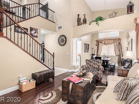 Gorgeous move in ready 2 story, 5 bed/3 bath southwest Las Vegas home available in Clearwater Cove. Excellent gated community, surrounded by parks, shopping and restaurants. Must see interior features a formal living and dining area with dramatic vaulted ceilings. Beyond, the spacious separate family room boasts built-in shelving and a charming fireplace. Stylish open concept kitchen is complete with sleek quartz counter-tops, crisp white cabinetry, subway tile back-splash, ss appliances and an island with breakfast bar seating. 1 bedroom and full bath downstairs. Remaining bedrooms are upstairs as well as a large loft. Master retreat includes a lavish en-suite with dual sinks and separate soaking tub and shower. Inviting backyard with covered patio, pavers and lush mature landscaping. Comes with a fruit bearing apple, peach & fig trees, with grape trellis! This gem is a must see. Schedule your showing today.