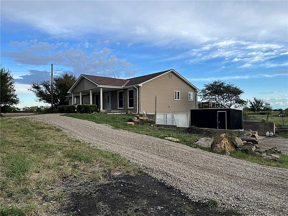 Charming Country Retreat on nearly 10 Acres. Welcome to your dream home! Nestled on a sprawling 9.5-acres surrounded by farm land and only 20 minutes from Olathe Medical Center, this newly remodeled country retreat offers the perfect blend of modern amenities and serene countryside living. Key Features include remodeled interior featuring a large brick fireplace, fresh paint, updated flooring, and modern fixtures throughout. The large living and formal dining areas are perfect for entertaining, with large windows that invite plenty of natural light. The kitchen boasts a new stainless-steel cooktop, walnut butcher block countertop, and white cabinetry, making it a chef’s delight. The Primary Suite includes a walk-in closet and double vanities with a separate shower. The newly remodeled guest bath includes a tub and shower combo, new quartz top vanity and fresh lighting and plumbing fixtures. Three additional bedrooms offer plenty of space for family and guests.
