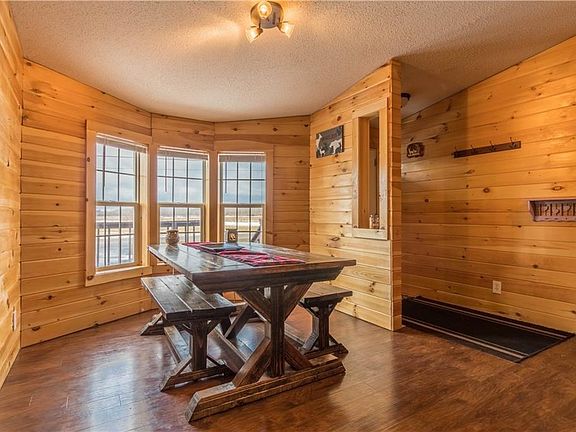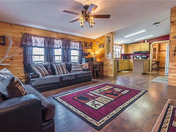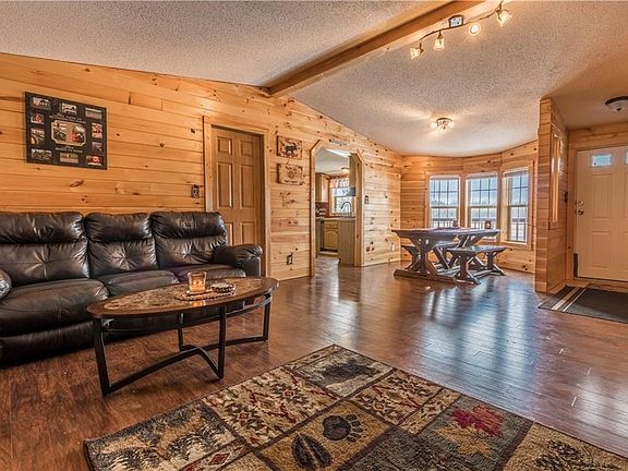 This home has been completely remodeled into a cozy 3 bedroom 2 bath home with a log cabin feel. From the wood floors to the knotty pine walls, open floor plan, cozy 2nd living room with stone fireplace, huge 2 stall garage with workspace, huge yard, large circular driveway, this home offers so much! New updates include new metal roof on the garage, all new blown in insulation in the garage, high efficiency furnace in home and in garage, flooring, walls, lighting and paved driveway. This home has so much to offer. Make an appt today!