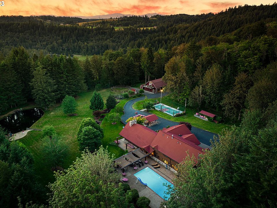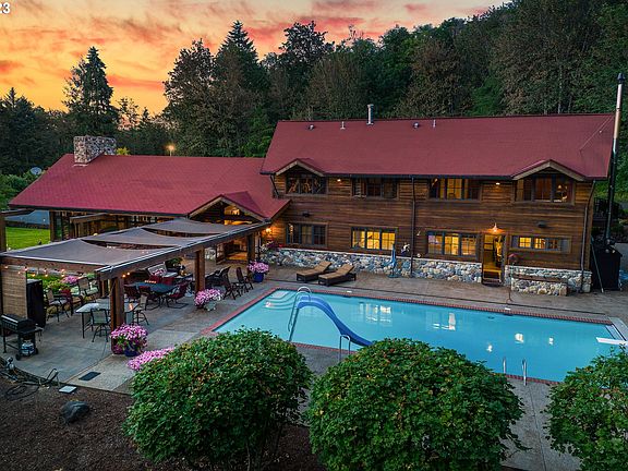 Enjoy the privacy and seclusion of Emerald Springs Ranch, 54 spectacular acres just 35 min from downtown Portland Oregon. Gorgeous resort-like atmosphere with a grand, craftsman-stylebuilt lodge, luxurious pool and outdoor entertaining area. Custom-built for comfortable living, the home features 5 bedrooms including the primary suite on the main floor. This one-of-a-kind property includes a barn with upstairs apartment and rec space, potable freshwater springs, hay pasture and miles of trails.
