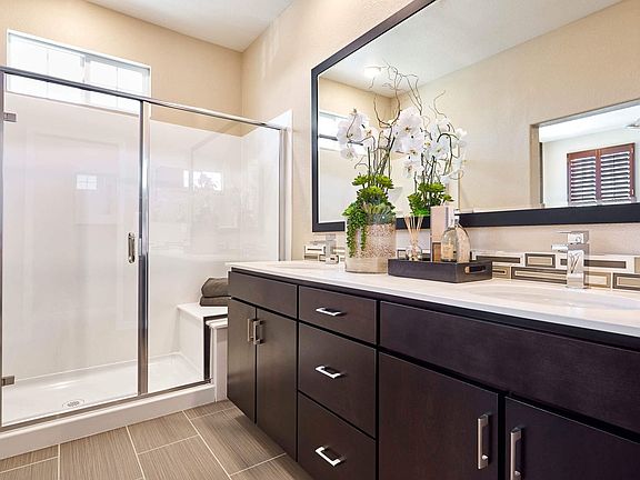 Private patioPrimary suite upstairsElegant interior designHuge walk-in closetGorgeous designer bathroomLovely tile flooringRecessed lights