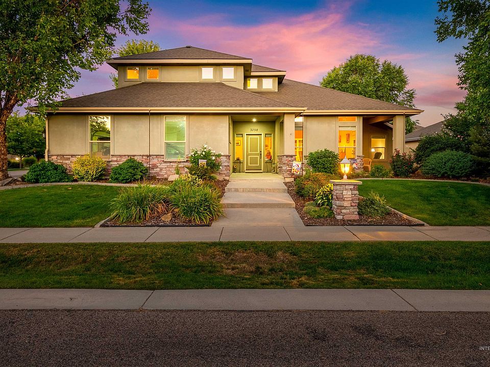 Stunning single level w/upstairs bonus room in Tuscany! 4 bedrooms or 3 bedrooms plus bonus room w/3 full bathrooms and an office/formal dining room. Tile entry, hardwood floors through entry, great room & dining room. Open floor plan w/split bedroom design. Great room features fireplace w/ hearth and mantle. Kitchen features breakfast bar, island, granite counters, NEWER stainless-steel appliances w/gas range, tile floors & pantry. Main level primary suite has walk out to private yard, dual sinks, granite counters, tile shower w/2 heads, jetted tub & walk in closet. Laundry room w/sink and cabinets. Corner lot with side car garage. Flex room shed w/covered porch & patio, full vinyl fencing, garden, auto sprinklers & pressurized irrigation. East facing back yard. Tuscany features parks, pools, ponds, lakes, elementary school, multiple entrances &easy access to the freeway & close to grocery shopping and hospital. Updated hvac, water softener & water heater.