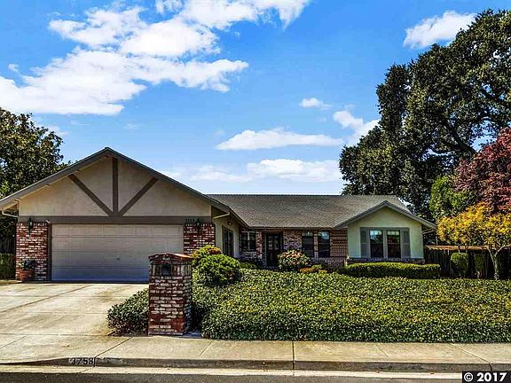 Cheerful, inviting single story home with hardwood floors, newer carpeting, and vaulted ceilings. Wonderful open floor plan with sun-filled rooms, exceptional backyard with covered patio and aggregate patio, fruit trees and gazebo. Formal dining room with built-ins. Living room with vaulted ceiling and backyard views. Chef's kitchen is huge with lots of counter space, garden window, double ovens, gas cook-top, walk in pantry. Breakfast room for casual dining. Fabulous family room with stone fireplace and built-in bookcase, storage and tile floors. Big bedrooms, large closets, master with vaulted ceiling, cedar lined closet. Master bath has custom tile, spa-like tub/ separate shower. Court location, amazing backyard. Great curb appeal.