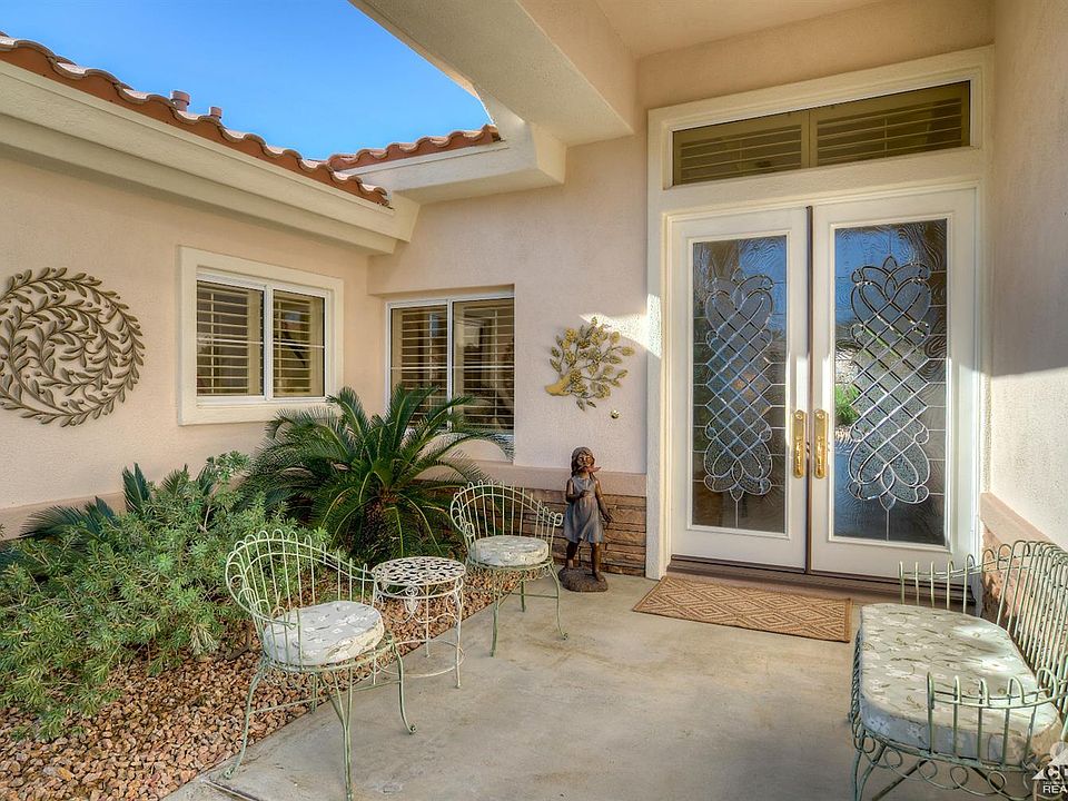 Sun City Palm Desert- Marquis. This immaculately maintained home w/newer HVAC & hot water heater has panoramic golf course & mountain views. The rear patio has multiple sitting areas & features an outdoor gas fireplace & retractable electric sunscreens. Stone faade provides elegance and along w/leaded glass doors & a gated courtyard, curb appeal. Inside, diagonally laid tile is used extensively. Shutters are throughout. 12ft coferreed ceilings are in the foyer (w/uplighting) & greatroom w/custom shelving. 10ft ceilings are elsewhere. The family room has a fireplace w/builtin cabinetry to each side. The kitchen has raised panel cabinetry w/pullout shelves wall oven. The den/office has custom shelving. A towering skylight & double doors lead to the master suite w/a bay window, coffered ceiling & huge walkin closet w/builtin storage. The master bath has duals sinks, stall shower & spa tub. The laundry room has extensive storage & utility sink. The 2+ golf cart garage has builtin storage.