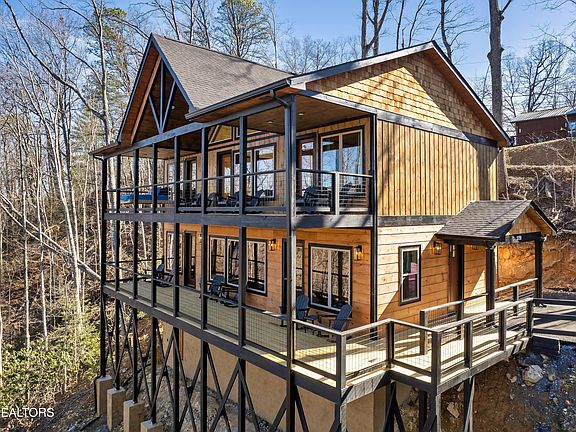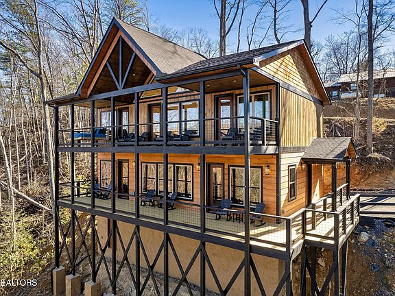 Imagine waking up in a tranquil Smoky Mountain haven, surrounded by nature's splendor and just minutes from the area's top attractions. Nestled on a quaint country road, this charming three-bedroom, three-bathroom cabin seamlessly blends rustic charm with modern sophistication. The exterior's rich, dark chocolate brown hue and dual brown wood tones evoke a sense of warmth, complemented by cedar shake accents and modern black lighting. Step inside to discover a haven of comfort and style. The grey stone fireplace anchors the living area, where tall ceilings and tongue-and-groove light wood walls create an airy feel. The kitchen shines with stainless steel appliances, dark wood cabinets, and granite countertops. The cabin's thoughtful design includes two entrances: one leading into the kitchen for easy grocery unloading, and another off the living room, offering breathtaking views through expansive windows. Retreat to the second floor, where a spacious porch beckons you to relax and take in the serene hollow views. Inside, a cozy fireplace awaits, perfect for chilly mountain evenings. The luxurious bathrooms boast a grey tile shower, grey rock accents, and granite countertops. Additionally, elegant tile surrounds the tubs, creating a relaxing oasis perfect for unwinding after a day exploring the Smokies. Experience the best of both worlds: seclusion and tranquility in a stunning mountain setting, with easy access to Tanger Outlet Mall (24 minutes), Gatlinburg (10 minutes), and Dollywood (20 minutes). This is your peaceful haven, wrapped in the serenity and beauty of the mountains, where tranquility awaits. Drone photography used.