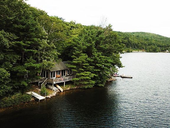 Experience the charm of lakeside living in this rustic three-season waterfront bungalow, nestled right at the water's edge on Jacobs Ladder Road. This cozy retreat features three inviting bedrooms and a well-appointed full bath with a shower. The generously-sized living room serves as the heart of the home, offering panoramic views of the tranquil lake, and providing the ideal setting to soak in breathtaking sunsets in the evening. The expansive deck, perched directly above the water, invites you to bask in the warmth of the sun, whether you're sipping your morning coffee or enjoying a peaceful afternoon. The third bedroom is a true gem, boasting a sliding glass door that opens to reveal stunning lake views—allowing you to wake up to the gentle sounds of nature and the serene beauty of the water just outside your window. Whether you're seeking a peaceful getaway or a base for lakeside activities, this bungalow promises an idyllic escape surrounded by the natural beauty of along with all of the local amenities that Becket, Massachusetts has to offer such as hiking along with Jacobs Pillow Dance Festival.