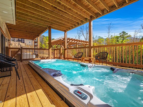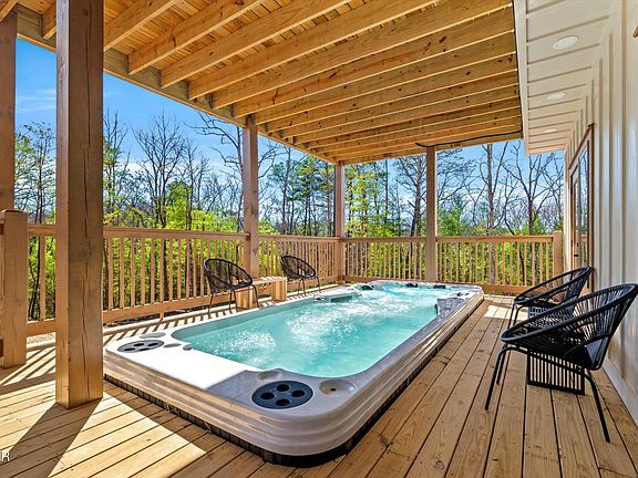 This nearly 4,000 square foot luxury chalet combines stunning architectural design with unrivaled comfort, perfectly positioned just minutes from downtown Pigeon Forge, Townsend, Dollywood, and the Great Smoky Mountains National Park. This stunning property delivers both convenience, breathtaking panoramic mountain views from over 1400 square feet of four levels of expansive decks, and is packed with state of the art amenities. It would make an excellent overnight rental, permanent residence, or second home. The main level of this immaculate home welcomes you with a spacious great room featuring an open concept design that seamlessly connects the living area, dining room, and gourmet kitchen, which features true custom cabinetry and an oak dining room table crafted by a skilled wood craftsmen.The main level houses the private primary suite with ensuite bathroom, which includes a soaking tub, along with a versatile bonus room, featuring bunk beds, and convenient half bath. Ascend to the second level, where you'll find two suite-style bedrooms, each with private closets and bathrooms, plus an open den area with an additional workspace. The lower level provides endless entertainment options with a spacious recreation room, private media/theatre room, featuring a Multicade with 60 classic games, and two additional bedrooms with private closets and bathrooms. Step outside to discover a true mountain oasis featuring a magnificent 19-foot recessed swim spa that reaches hot tub temperatures for year-round enjoyment and a beautifully designed outdoor seating area beneath a pergola with custom tiled gas fire pit.