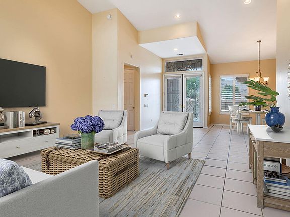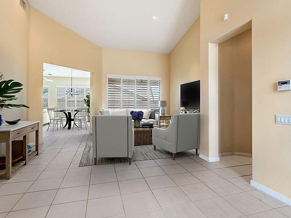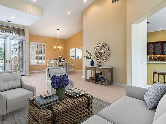 Welcome home to picturesque Sun City Palm Desert, the premiere 55+ community. This tastefully updated San Remo model has vaulted ceilings with abundant indirect natural light, tile floors, formal living and dining room, a powder room plus a spacious family room looking out to the covered patio and in-ground spa. The kitchen boasts granite counters, glass tile backsplash, undercabinet LED lighting, stainless DACOR stovetop, dual ovens, built-in microwave and vent hood, a KitchenAid refrigerator, pull out shelves and a pantry. There are plantation shutters throughout the main living areas. The family room has a fireplace, surround sound speakers, built-in wood cabinets and mirrored glass shelving. The Primary suite occupies one side of the home and is truly an owner's retreat with a large sumptuous bathroom everyone dreams about. The two guest bedrooms are on the opposite side of the home and are separated by a full bath. The utility room has been converted to an office with the laundry in the air-conditioned two car plus golf cart garage. There are separate HVAC systems for the living areas and bedrooms. This home is move-in ready and is waiting for you!