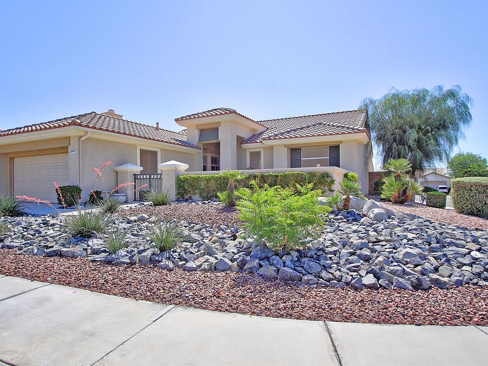 Sun City Palm Desert -Morocco - Peek-a-boo mountain views from elevated front patio and private backyard which has an extended patio and Aluma-wood awning. Situated on a corner lot this open, great room plan has upgrades galore! Diagonally laid tile flooring, upgraded cabinets, Corian countertops, and shutters throughout. Custom built-ins in den and 2nd bedroom which has a Murphy bed. Master suite features a bay window, double sink vanity, and walk-in closet. Easy care desert landscaping in front yard, and lush green grass in backyard. Oversized 2-car garage with room for a golf cart! You don't want to miss this one! Furniture by Inventory available outside of escrow. Vacant-Go direct.