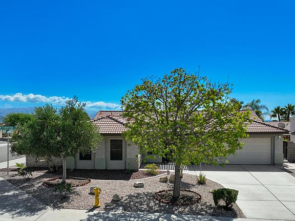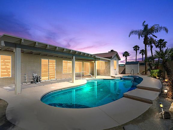 Situated on a desirable corner lot with desert landscaping and an extended driveway, this stylish home offers a warm welcome and smart layout. A covered walkway leads to the front entry. Inside, you're greeted by a spacious living room with vaulted ceilings and a wall of windows viewing the backyard and sparkling pool and spa. A formal dining area--formerly the fourth bedroom could also be used as an office or a fourth bedroom.The open-concept kitchen and family room feature a cozy fireplace, a center island, black granite countertops, and stainless-steel appliances, pull out drawers in the cabinets, including a gas range, microwave, large sink, and refrigerator with ice maker. 4 large windows offer excellent light. Freshly painted walls and recent repairs reflect the home's well-maintained condition.The split bedroom floor plan provides ideal privacy. The primary suite with vaulted ceiling is located to the right of the entry and includes direct access to the pool/spa and backyard retreat. The hall near the kitchen leads to a Full Bath and Two guest bedrooms that share a versatile open space--perfect for a TV lounge, study area, or home school setup.Conveniently located in the hall near the Primary is a laundry area and access to a deep two-car garage with utility sink and built-in storage. The backyard is designed for relaxation and entertaining, with low-maintenance landscaping and a long, covered patio--partially solid for shaded dining and partially slatted for filtered light. Enjoy stunning views of the South Mountains while dining al fresco. A storage shed adds extra utility, and the split-zone HVAC system ensures year-round comfort. Near Eisenhower Health main campus, Desert Willows Golf Resort. 3 Grocery stores, restaurants and the I-10 on ramp nearby on Monterey or Cook Street. This is an excellent centrally located neighborhood with No HOA dues and in the desert hub.
