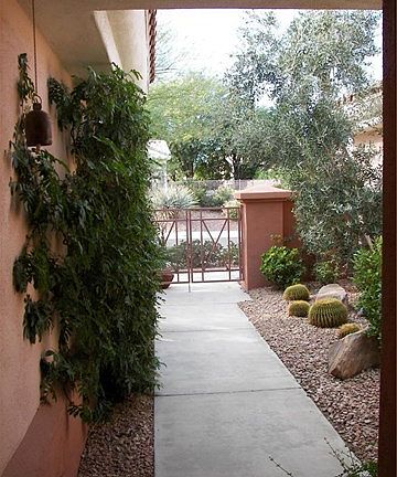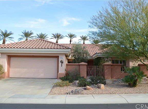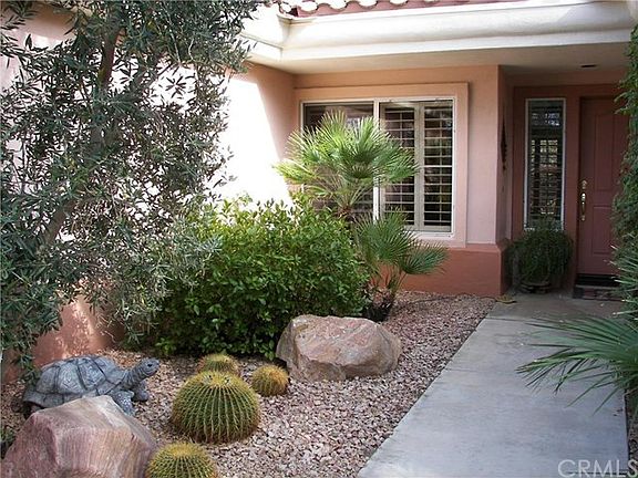 This gorgeous turnkey home is immediately inviting with its gated courtyard and attractive desert landscaping. Upon entering this bright and cheerful home, you are greeted with extensive use of tile and wood flooring, 10' ceilings, transom windows, plantation shutters, arched hall entry, beautiful ceiling fans, and remodeled kitchen with bay window, granite counters, soft-close cabinets and drawers, black silgranate sink, goose neck faucet, and stainless steel appliances. The master suite has a bay window and large walk-in closet, and the master bath has dual sinks, a large stall shower, and large skylight. Both bathrooms have been upgraded with new counters, fixtures, and refinished cabinets. The laundry is located inside, and the HVAC was replaced 3 years ago. This home has an east facing rear yard with no homes behind it providing views of the Shadow Mountains. With its spacious covered patio, lush landscaping, tall palm trees, and numerous fruit trees, the backyard is peaceful and ready to enjoy. The 2 car garage has new flooring, and a nook for golf cart parking. Located a short walk to the Mountain Vista Clubhouse with indoor and outdoor pools and close to shopping. PRICE INCLUDES GOLF CART AND ALMOST ALL FURNISHINGS!!