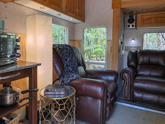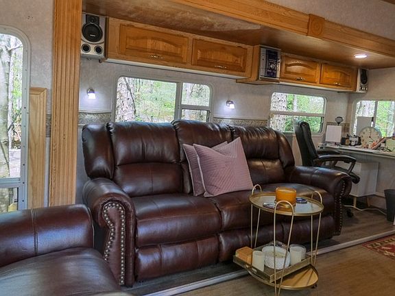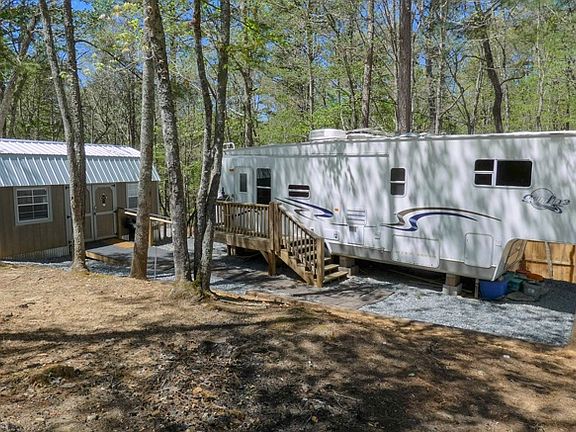 This renovated 32' 2003 Sunline Solaris 5th wheel camper will wow you with the updates creating a superior living space within the Coosawattee River Resort! Seller has added new wood laminate flooring throughout, full sized fridge (warranted through Feb), 31" flatscreen, new ceiling fan/light, updated lighting, custom built queen bed, full sized toilet, new ceiling in bedroom. Built up retaining walls, fresh gravel, installed 3/4 privacy fence (you can enclose back or chainlink it!), heated insulated water lines, rebuilt the deck and more. The 10x20 storage barn has extra storage lofts and a ramp for easy in & out for all your garden tools. You really must see it to appreciate! Price is firm.
