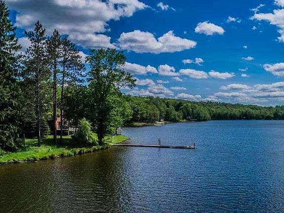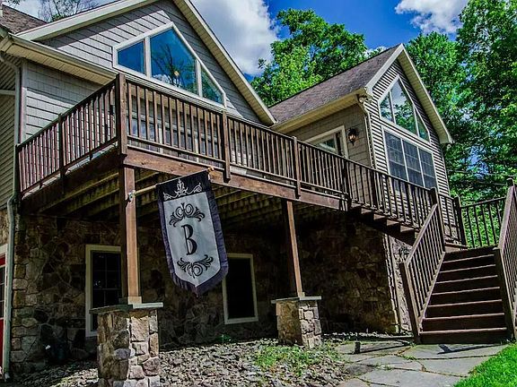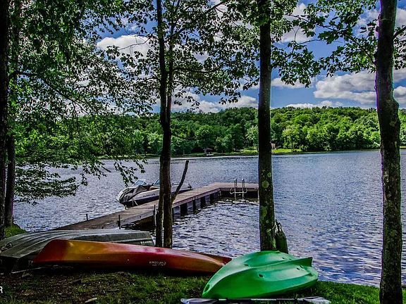 SPECTACULAR CUSTOM CONSTRUCTION LAKE ALDEN LAKEHOUSE ON A DOUBLE LOT, WITH 4 BEDROOMS, 3 BATHROOMS, 18-FOOT-HIGH CATHEDRAL CEILINGS, 2 FLOOR TO CEILING AUTHENTIC STONE FIREPLACES, DIRECT LAKEFRONT ACCESS TO PRISTINE POWERBOATING LAKE ALDEN AKA LONG POND WITH STUNNING LAKE VIEWS AND A PRIVATE COUNTRY LOCATION JUST NORTH OF HONESDALE, PA! This luxurious home has timeless qualities from the stone details on the exterior to the expansive front porch for leisurely lounging and panoramic lake views plus the screened porch, just steps off the kitchen and back deck with stone patio and privacy for outdoor gatherings around the firepit. With easy access to 75-acre Lake Alden, enjoy the thrill of powerboating, the tranquility of kayaking, the refreshing embrace of swimming, and the serenity of fishing or canoeing. This grand construction lake home has nothing but high-end details. The 18-foot-high cathedral ceilings create an airy and expansive ambiance, complemented by the magnificent floor to ceiling stone fireplace and luxury flooring that graces the interior. The well-appointed kitchen features top-of-the-line stainless steel appliances and an inviting island, perfect for culinary creations and casual dining. Enjoy the amazing primary bedroom on the main level with vaulted ceilings, walk in closets and breathtaking lake views. The additional bedrooms and bathrooms are designed with the utmost consideration for comfort and style. The lower level offers another living area complete with yet another striking stone fireplace. The oversized garage has double doors to easily store kayaks, ATVs, and other toys. The extra storage throughout the home is ideal for lake living. This home also has a great short term rental history to help pay for your expenses. Impeccably maintained and in mint condition, this gorgeous home embraces luxury, comfort, and natural beauty. Make this golden opportunity yours and call yourself the owner of this impressive Lake Alden home!