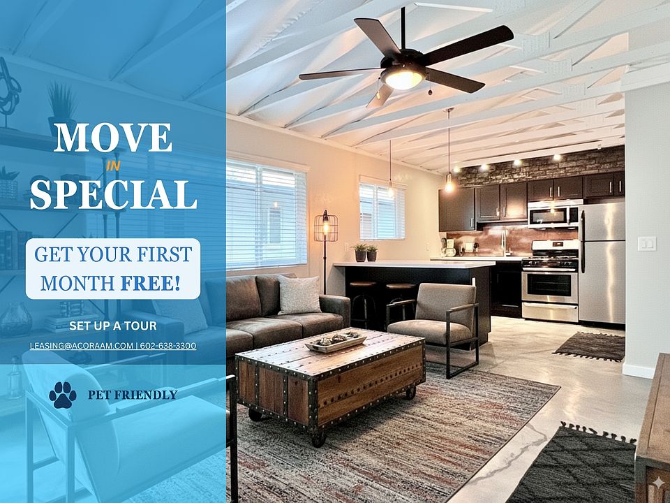 - Exterior features: Central Phoenix, Children's Hospital, Downtown Living, Electricity not included in rent, First Month Free, Gas not included in rent, Heating system: Forced Air, Industrial Finishes, Midtown Phoenix, Modern Finishes, Move In Special, Move in Special 1 MONTH FREE, Newly Renovated, One Story Complex, Stainless Steel Appliances, Utilities fee required