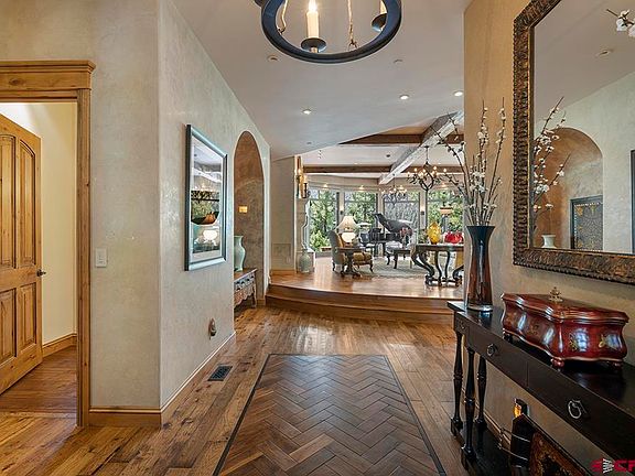 Enjoy the exclusive Glacier lifestyle in this stunning Classique-built Colorado dream home! This spectacular 6,720 SF 4 bedroom, 6 bathroom home is situated on 1.2 acres, perched high above the perfectly manicured Glacier club greens, fairways, and large glistening ponds and a back drop of dramatic, breathtaking mountain views. Nestled among the pines on Glacier Cliff Dr. this home offers a private setting surrounded by beautiful, mature landscaping and natural glacial carved topography. Upon turning into the driveway, you will be welcomed home by the hand-crafted exterior stacked-rock front which showcases the exceptional work of art created by a master stone craftsman. The entrance and foyer open to an expansive, yet warm and welcoming great room with a large Italian travertine gas fireplace and walls-of-windows, complete with Lutron window treatments that open at a touch of a button to reveal the majestic views of the Hermosa Cliffs and Animas Valley. An adjoining wet bar includes an ice maker, refrigerator, wine refrigerator and dishwasher, perfect for entertaining family and friends. The home features many fine touches and custom accents throughout, including; impeccable tile and granite work, recently refinished hand-laid walnut floors accented with hickory and ebony touches in the great room, and new walnut wood floors in the primary, guest, and media room. The great room ceiling is adorned with 100-year-old wood-beams, imported Italian travertine fireplaces throughout, and a gorgeous Ula Darni chandelier in the dining room. Highlighted by unique hand-hewn beams and inlaid brick ceiling, this exquisite kitchen is a chef's dream; offering new appliances featuring Wolf convection wall oven, an eight-burner Wolf cooktop with hand-painted tile backsplash, a warming drawer, pot-filler, Miele steam oven and Wolf microwave, large professional Sub-Zero fridge/freezer and Cove dishwasher. The central island completes the kitchen space beautifully, adding seating for friends and family to join the chef, plus more countertop space, a prep sink and under counter storage, leaving no detail overlooked. The spacious primary suite and office is located on the main level in a separate section of the home to deliver ample privacy. The primary bath features his n' her baths that share an oversized steam shower, a spa bath, vanity and bidet and includes a stacked laundry closet in the master for added convenience. There is a second primary/guest suite on the main floor that features a lovely ensuite bath with his n' her sinks, tub, and steam shower. The main level also hosts a media room and spacious laundry room with lots of storage. The upper level has two ensuite bedrooms that share a loft-style TV and relaxation space. The lower level features a game room with a custom pool table, large flat-screen TV, a second wet bar, and a temperature-controlled wine cellar with a capacity for 500 bottles! The oversized, heated, 3-car garage includes a wall of custom storage as well as a convenient dog wash. The property has been beautifully re-landscaped with irrigation and natural gas fire pit making it perfect for relaxing by the fire after a day of hiking, playing a round of golf on one of Glacier’s award winning 18 hole golf courses, or a day of skiing at Purgatory Ski resort. Glacier's top tier 100K Aspen Platinum Level club membership included.