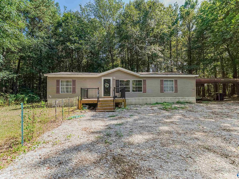 Beautifully wooded 2 acre tract in the country! Features a manufactured home, with 3 bedrooms and 2 baths. Full kitchen and pass through laundry room. Covered deck in rear. Large 2 car carport adds covered parking spaces. Storm shelter. Outbuilding adds additional tool or equipment storage. Recent updates include new HVAC unit and beautifully custom built front porch. Perfect fixer upper with amazing potential! This property is being SOLD AS IS/WHERE IS.