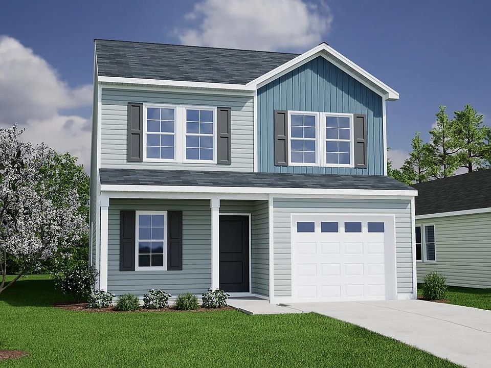 Welcome to this beautiful Evans floorplan, a perfect blend of style, space, and modern design including a Primary bedroom on the main floor. This stunning home features 3 spacious bedrooms, 2.5 baths, and 1,736 square feet of impeccable design with an open, inviting layout that is perfect for both family living and entertaining. The heart of the home is the well-appointed kitchen, featuring sleek countertops, modern appliances, and ample cabinet space and a refrigerator. It flows effortlessly into the dining area and family room, making it ideal for gatherings and family dinners. A convenient half bath is located just off the main living area for added guest convenience. The first floor has all upgraded LVP flooring and carpet upstairs. The Primary bedroom is large and on the first floor it connects to a generous walk-in closet, 5 -foot shower, two sinks in the large vanity. Two additional well-sized bedrooms are located upstairs, sharing a full bath. Perfect for guests, these rooms provide comfort and privacy.