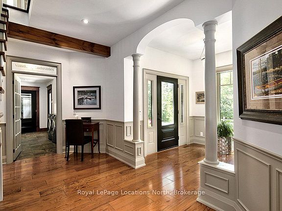Discover a rare gem in Lora Bay, steps from the beautiful Lora Bay beach. Rainmaker Estates meticulously designed and custom-built 6 bed residence, perfectly positioned across from Georgian Bay, this Sunset Blvd location offers unparalleled luxury and convenience. 4300sqft of living space, this home features a thoughtful open concept layout on the main floor. The space is graced with exposed wood beams, lovely hardwood floors & wood ceiling.The chef's kitchen, complete with top-of-the-line stainless steel appliances, seamlessly connects to the dining room and the light-filled great rm. The great rm boasts a double-height cathedral ceiling and stunning stone and copper-clad gas fp, creating a focal point of warmth and sophistication. The main foor also includes a sun room, mudroom w/convenient main floor laundry and luxurious primary suite, complete with a 5pc spa-like ensuite bath. The mudroom opens onto a poured concrete covered front porch and has access to the3-car insulated/heated garage. Upstairs, you'll find 3 more beds, a stylish 4pc bath with a clawfoot tub and a bonus area that overlooks the great room below offering breathtaking views of Georgian Bay! The lower level is a true entertainer's space, featuring 9ft ceilings, radiant in-floor heating throughout, 2 bedrooms, and a 3pc bath. The expansive rec room, with its gas fireplace and wet bar, is perfect for gatherings, while the private home theatre adds a touch of luxury for movie nights. Every inch of this property has been thoughtfully crafted, including professional landscaping by The Landmark Group. Enjoy the meticulously designed flagstone patios and walkways, custom gas fire pit, pergola, dedicated dining area, extensive stonework is imported from Tobermory and 75 newly planted trees for added privacy. The home is supported by a Generac generator system. Lora Bay residents enjoy access to a wealth of amenities including the golf course, a restaurant, a members-only lodge, a gym and 2 beaches.