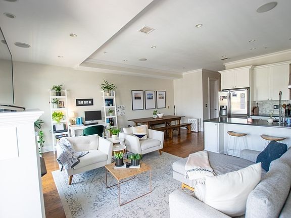 This gorgeous 2 bed, 2 full bath condo spans over 1,300 sq ft, has a desirable open concept layout with kitchen bar, high-end stainless steel appliances, dining and living area combo, perfect for family, friends and guests! Beautiful hardwood floors and 10ft ceilings span throughout the entire condo. Modern bathrooms consist of tiled wood floors and subway tiled showers. The generously sized primary suite is detailed with a chandelier, accent wall and ensuite bath. Condo layout provides maximum privacy for both bedrooms with the added bonus of an amazing back deck view of Boston's downtown skyline. Not only is this condo great on the inside, it is only steps away from the Broadway Red Line T-Stop, fantastic restaurants and coffee shops; a commuters dream! In addition the condo comes with in-unit laundry, one temperature controlled deeded garage spot and private storage. Available 9/1/25.